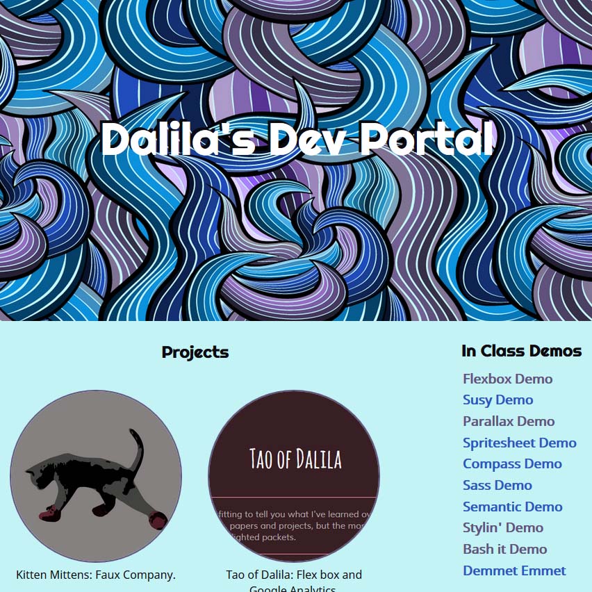 Older portfolio site. Fully handcoded (HTML/CSS/PHP)Web Development Class Project Site. Hand-codedDay in the Life of an Idea: Parallax narrativeCat Chase: Sprite and CSS3 (Compass) Animated ProjectKitten Mittons: Faux Company WebsiteTao of Dalila: Responsive page layout with Google Analytics